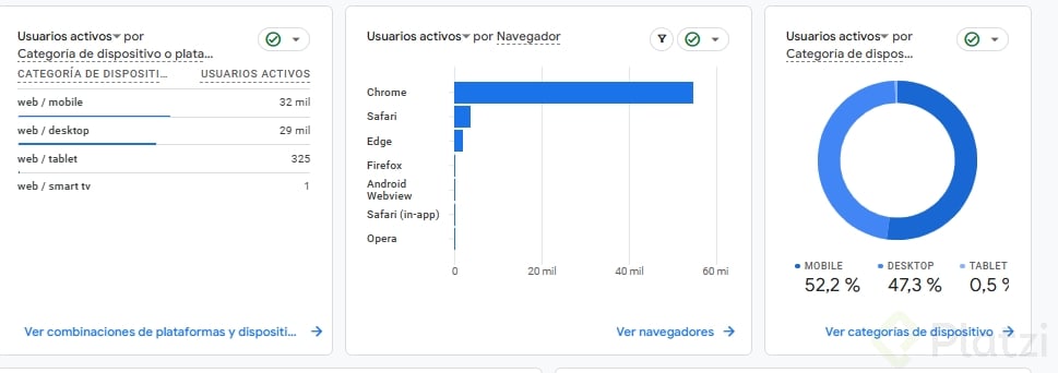 - Usuarios por plataforma: El análisis de usuarios basado en el tipo de dispositivo (desktop, móvil, tablet) puede informar tus decisiones al diseñar campañas o al desarrollar contenido específico para dispositivos populares.