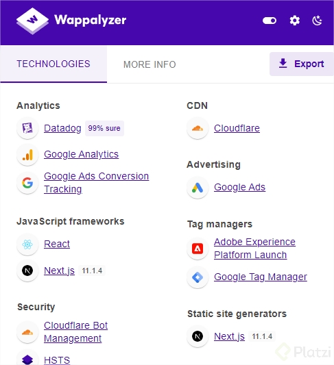 - Visita tu sitio web y abre la extensión para ver las tecnologías instaladas.
