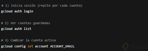 - [6:13] gcloud auth login: Cambiar cuenta de autenticación