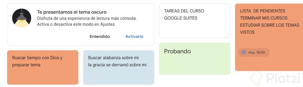 - Por último, añade una nota y una lista de pendientes en Google Keep, una de ellas con un recordatorio definido.