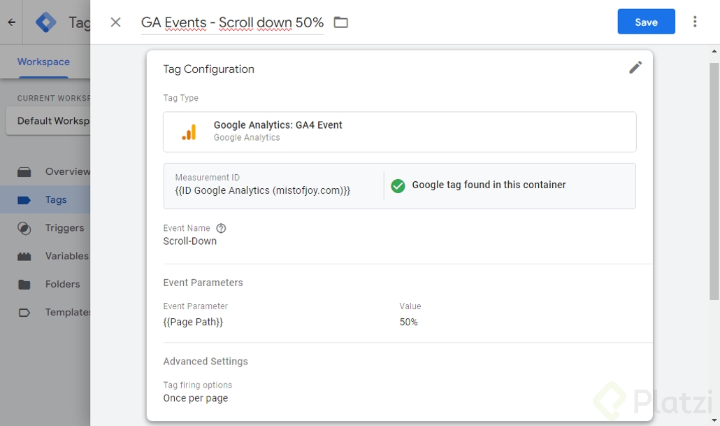 Page Pathcomo categoría yScroll Downcomo acción. - Etiquetado más dinámico: Aprovecha macros para valores dinámicos, capturando información adicional automáticamente.