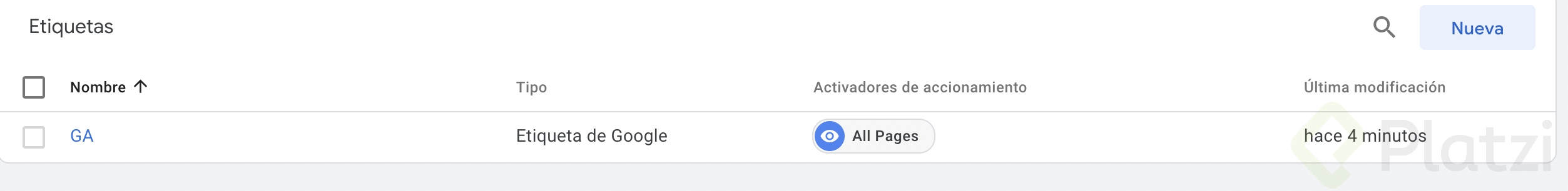 Luego regresa al panel de control del GTM, haz click en la opción “Etiquetas” que figura en el margen izquierdo, y allí podrás ver la etiqueta de Google Analytics.