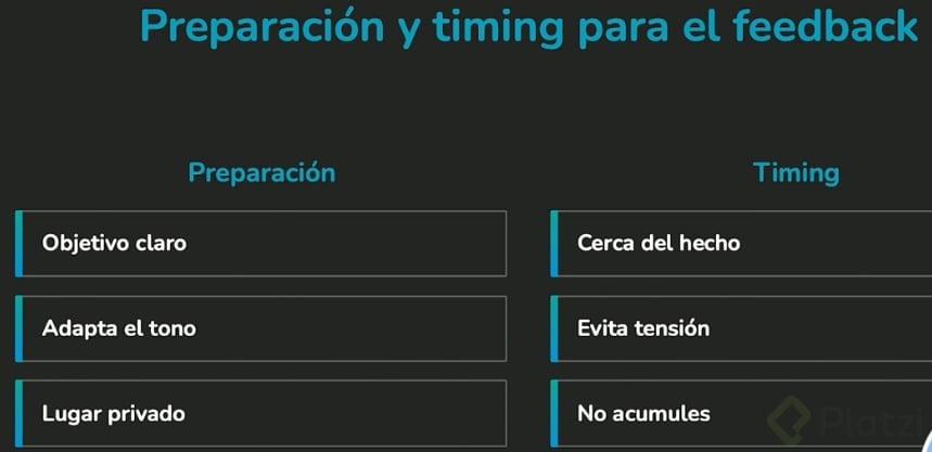 - Timing inmediato: no esperes evaluaciones mensuales, trimestrales o anuales. Hazlo cercano al hecho, no necesariamente on the spot, pero sí tras la reunión o en un momento próximo.