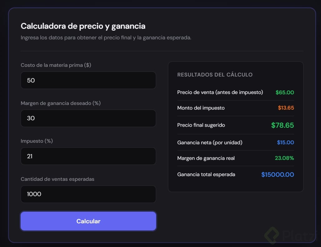 - Calcula la ganancia total esperada en función de las ventas proyectadas por el usuario.
