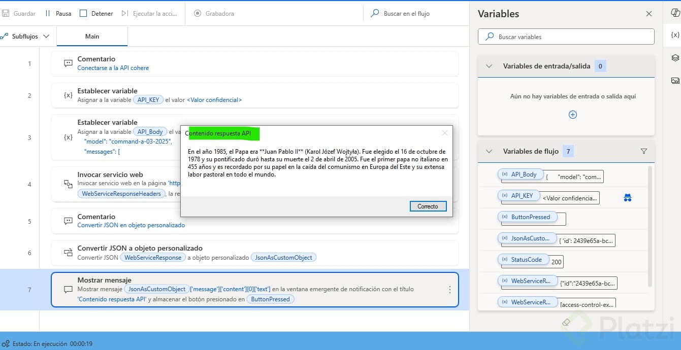 Power Automate y RPA nos permiten procesar respuestas de APIs de manera legible y manejable, guardándolas en variables que pueden ser manipuladas posteriormente en nuestros flujos de trabajo automatizados.