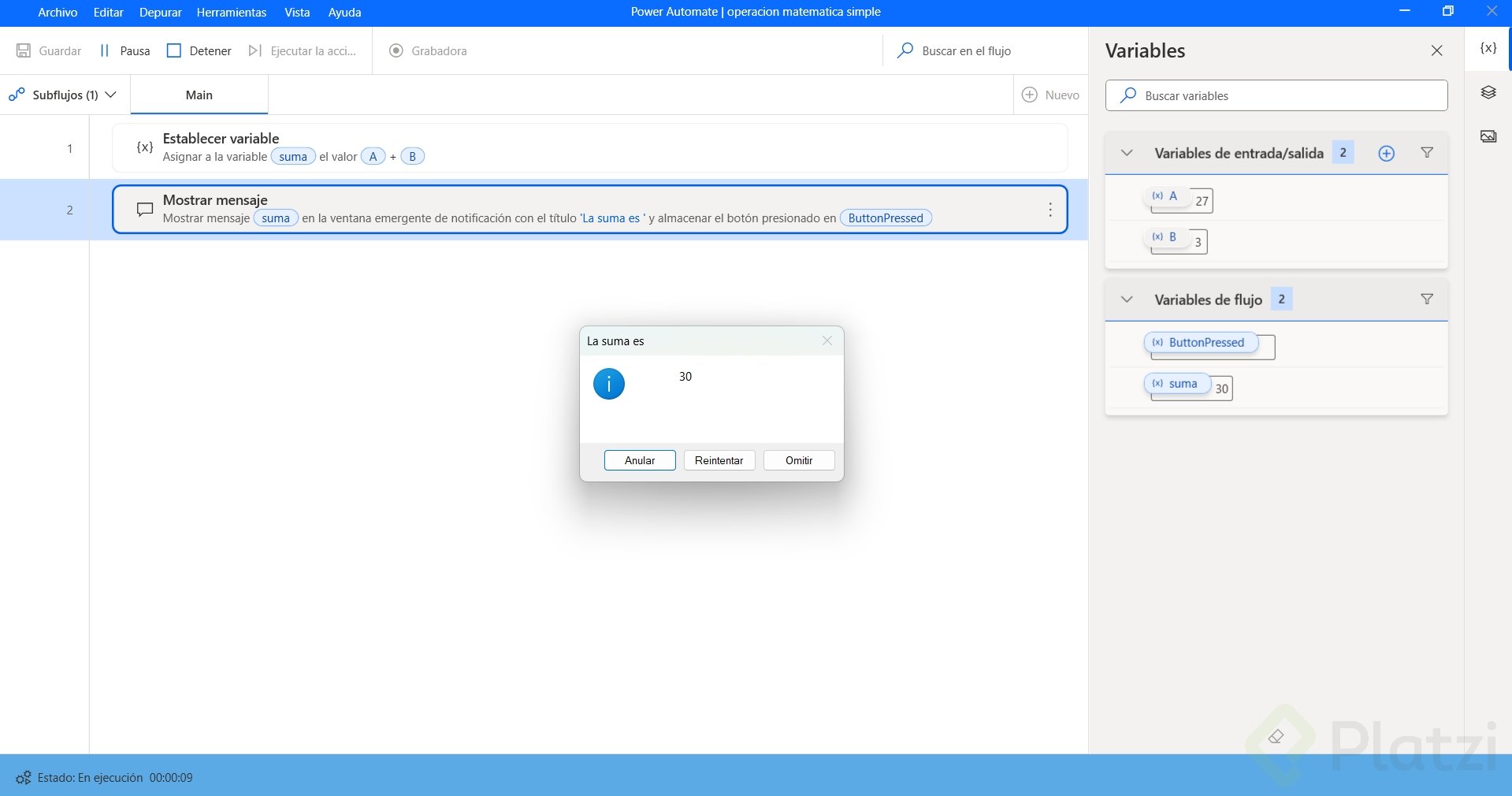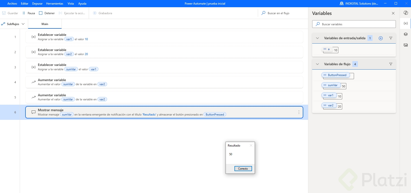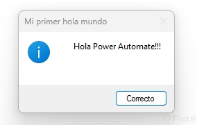 Al ejecutarse, aparecerá un mensaje emergente con el texto "Hola mundo". Una vez que hagas clic en el botón para cerrar el mensaje, el flujo finalizará y mostrará el estado "Preparado", indicando que se ha completado correctamente.