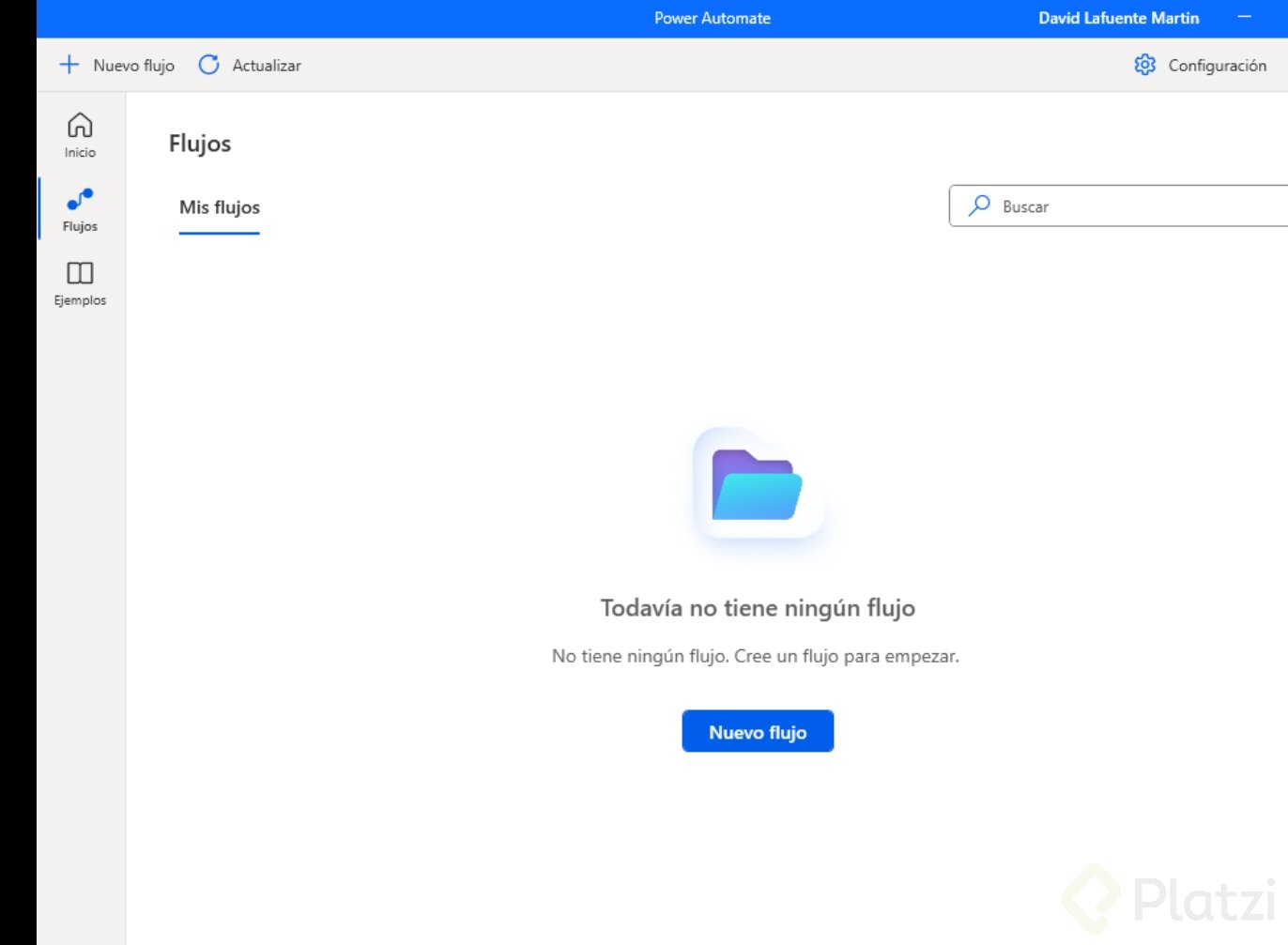 - En la interfaz de Power Automate Desktop, selecciona la opción "Flujos" y crea un nuevo flujo (por ejemplo, "Prueba inicial").