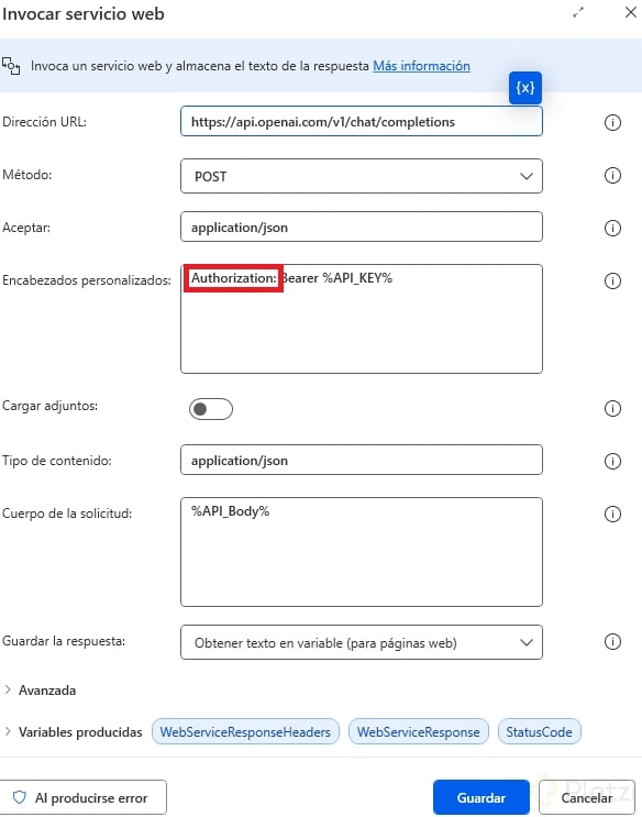 La acción principal para conectarnos a la API es "Invocar servicio web". Esta acción requiere varios parámetros que debemos configurar cuidadosamente: