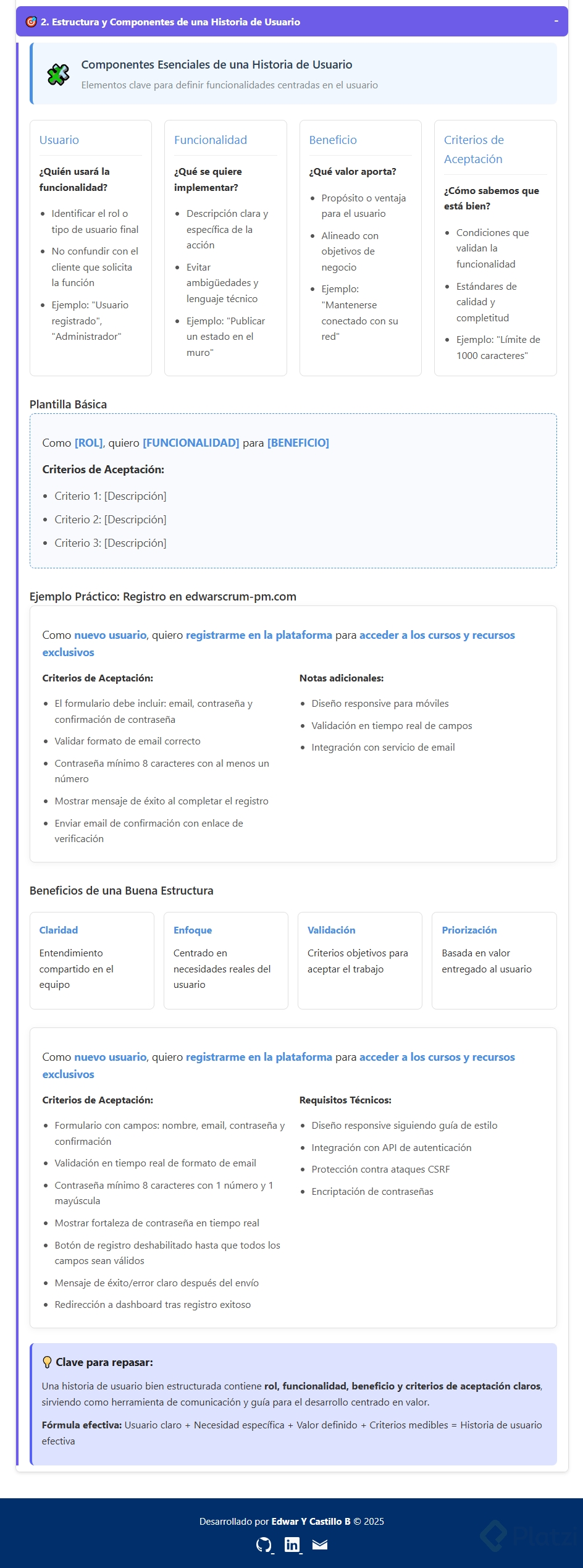 Crear una historia de usuario es fundamental en el desarrollo de software, ya que clarifica quién va a utilizar una funcionalidad, qué se espera implementar y, sobre todo, qué ventajas se persiguen. A continuación, te detallo los componentes de una historia de usuario que debes tener en cuenta para asegurar su efectividad.
