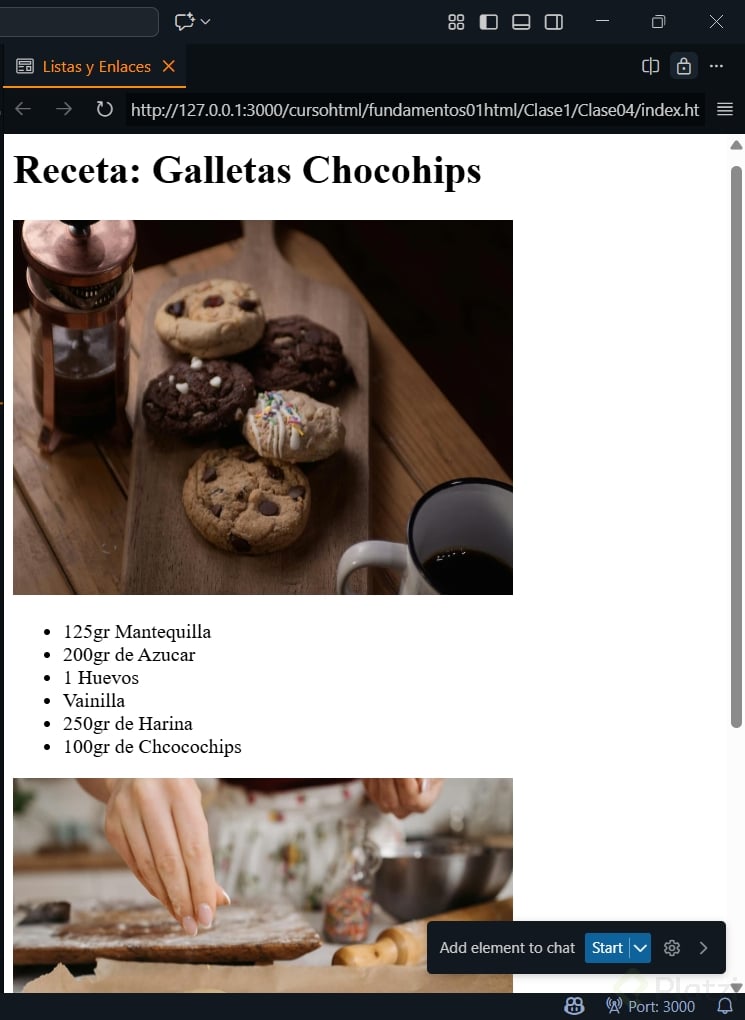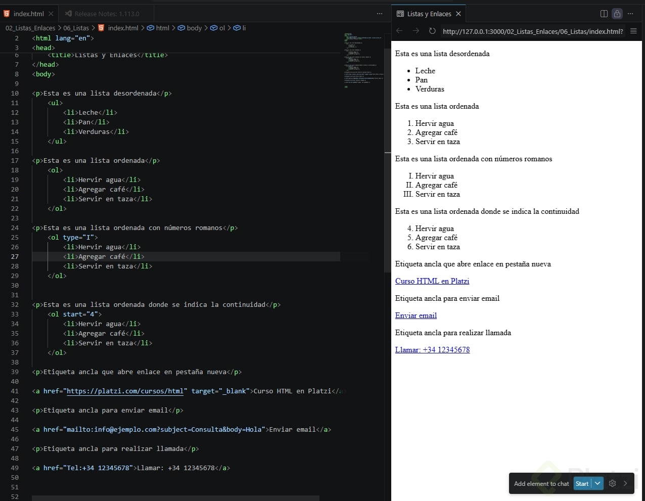 Aprende a estructurar contenido con listas HTML y a conectar páginas y acciones con enlaces. Verás cómo usar UL, OL y LI para organizar información, y cómo trabajar con A, href, target, mailto y tel para crear experiencias útiles y claras. Todo con ejemplos prácticos y listos para el navegador.