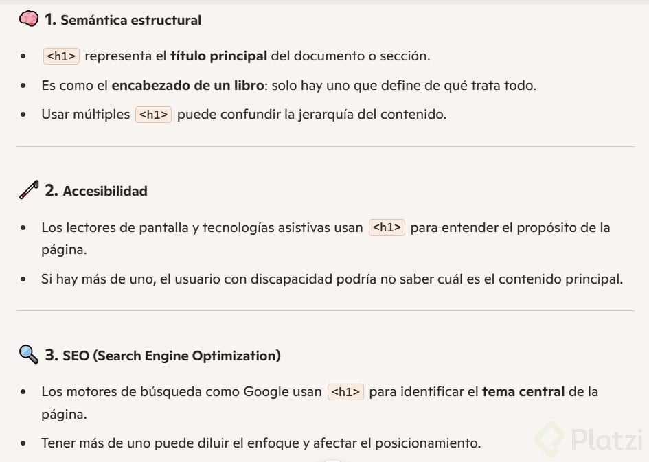 Los encabezados vienen con estilos por defecto que muestran su jerarquía visual. H1 es el más grande e importante. H2 es secundario. H3 funciona como subsecciones dentro de un H2. H4 a H6 siguen en menor importancia.