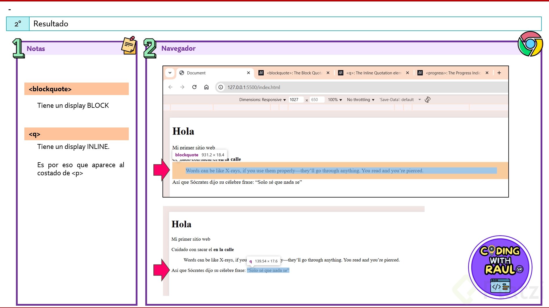 - Con el inspector de elementos puedes ver cómo el navegador aplica estilos distintos a blockquote y p.