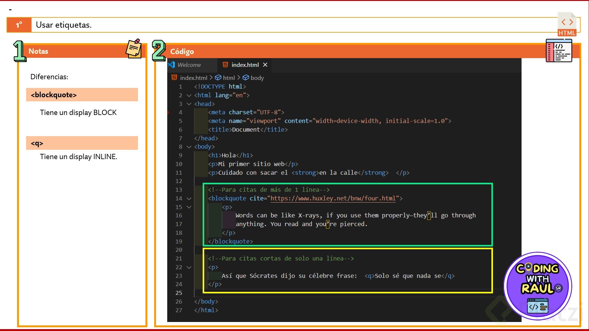 - Citar con blockquote y validar estilos en el inspector de elementos.