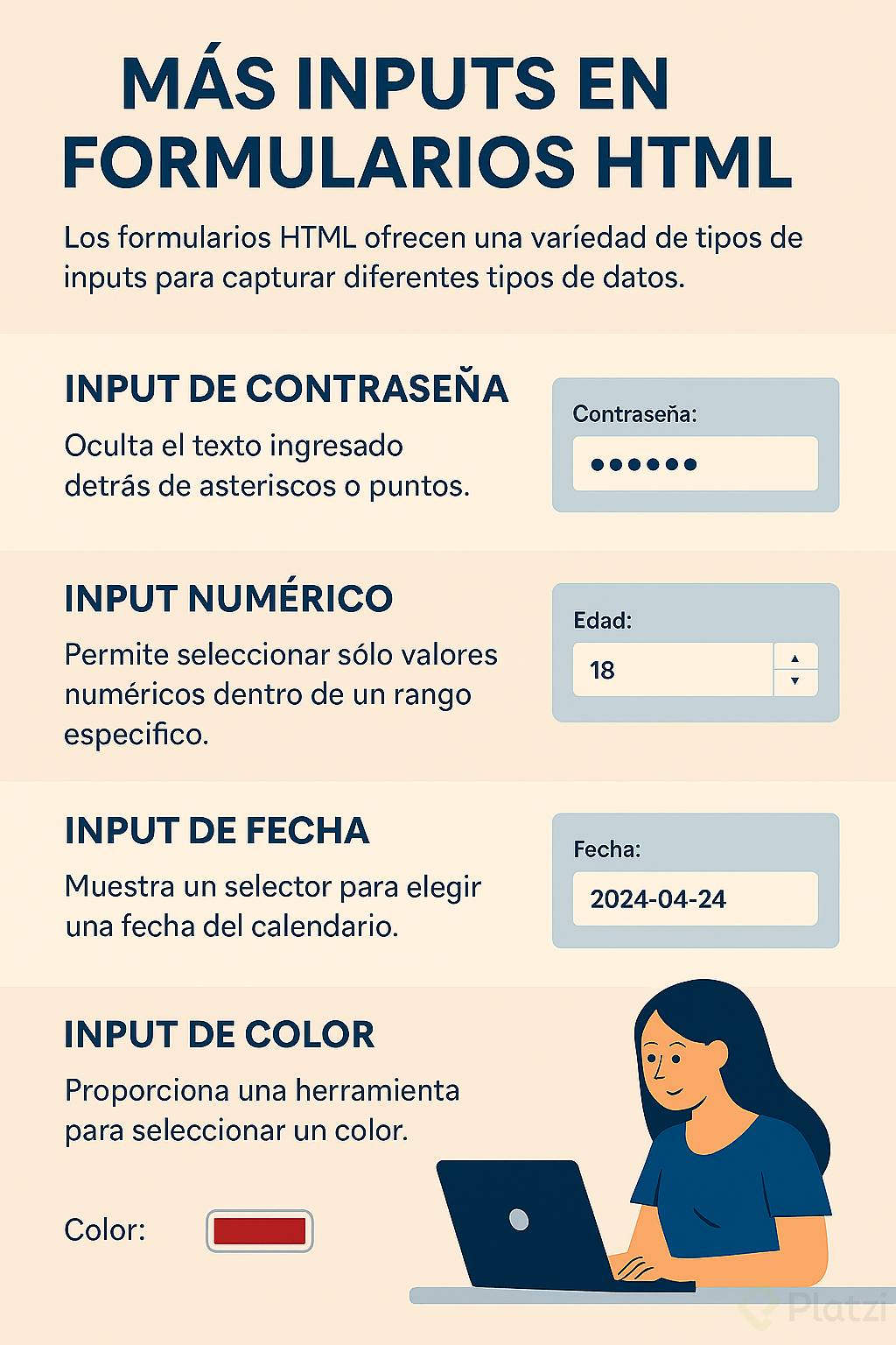 Los inputs adecuados mejoran la experiencia y la calidad de los datos. Con HTML puedes pedir contraseñas con privacidad, números validados, fechas con calendario y colores con un selector visual.