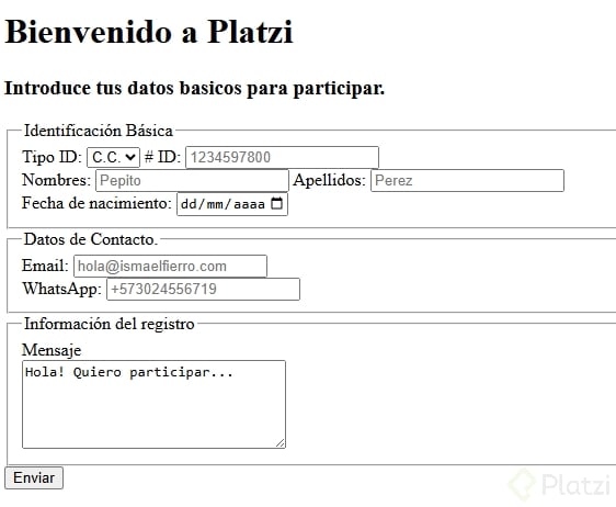 Ejemplo de correo con guía visual usando placeholder y obligatoriedad con require: