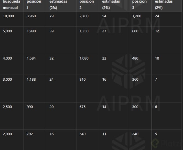 - Puedes calcular el total de búsquedas y, con base en eso, estimar el tráfico y conversiones potenciales según la posición conseguida en las páginas de resultados.