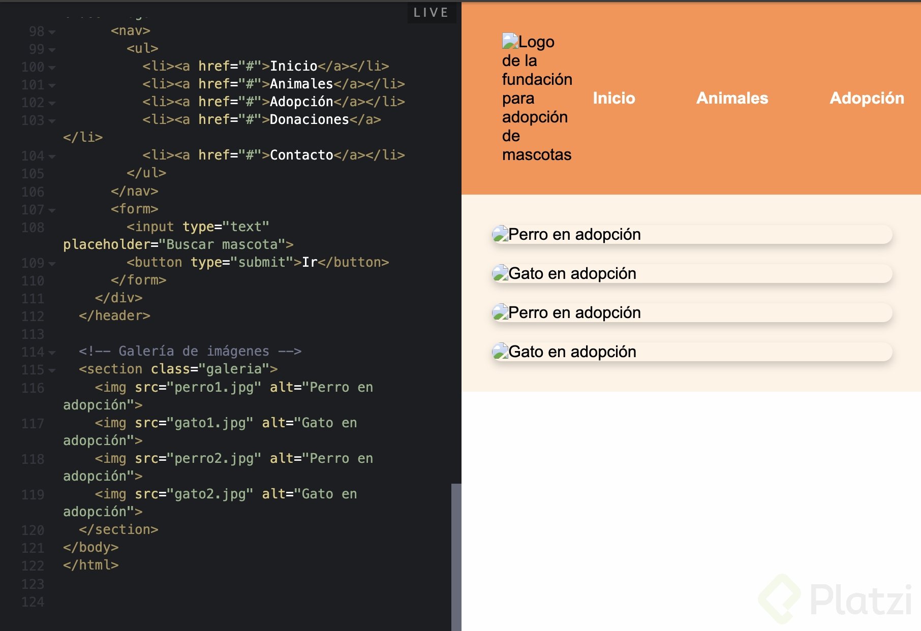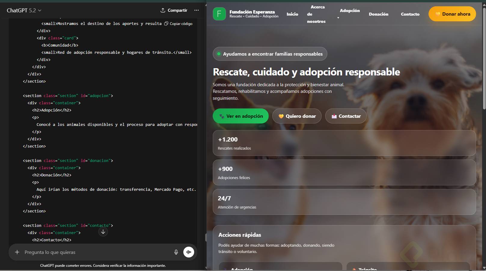 Menú de navegación (Inicio, Acerca de nosotros, Adopción, Donación, Contacto)” que ChatGPT le proporcionó al profesor Daniel Torres Burriel.