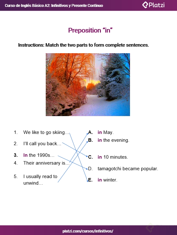 - En invierno (in winter), muchas personas disfrutan de actividades como el esquí.