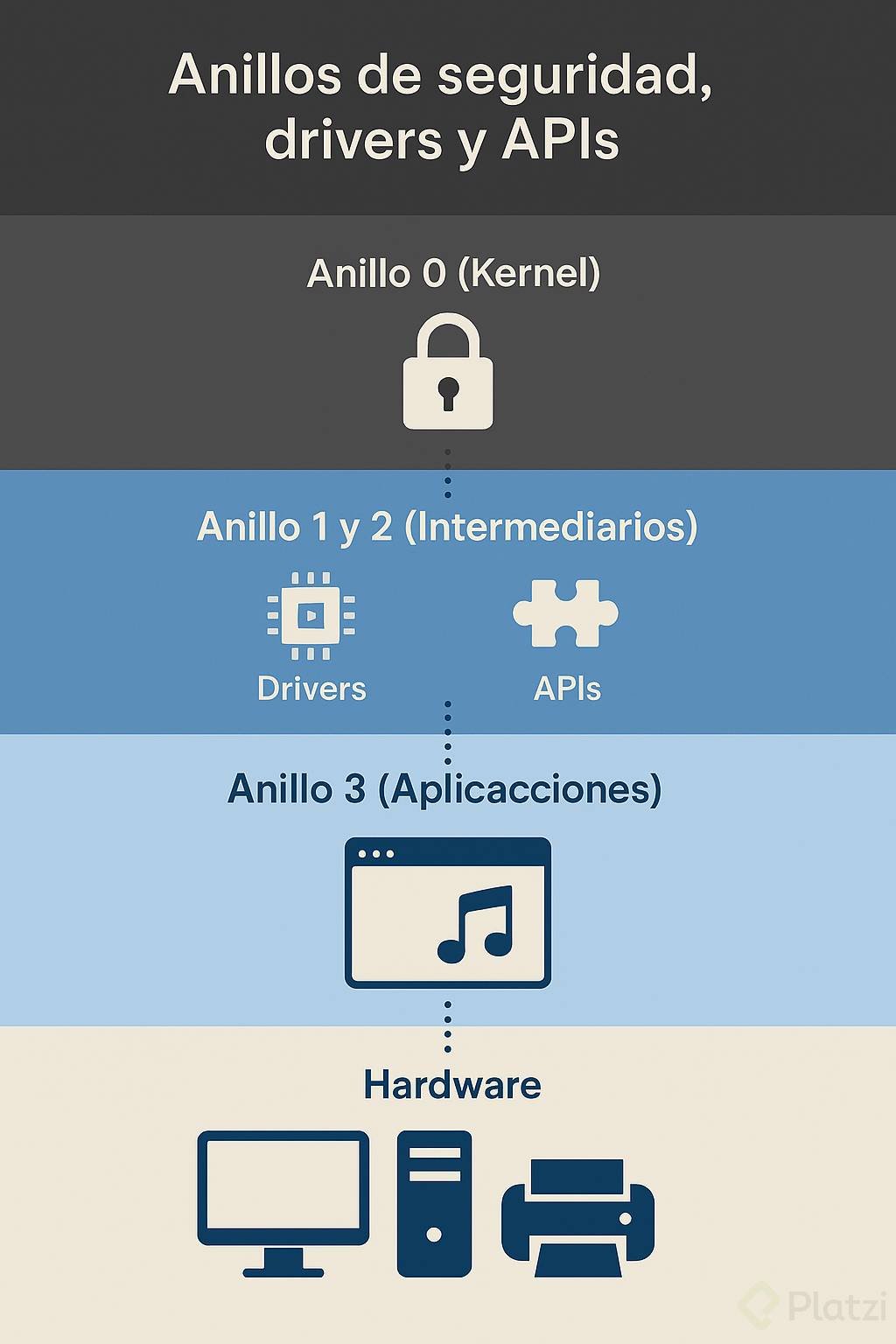 - Anillos 1 y 2: contienen el software que traduce entre el hardware y las aplicaciones (drivers y APIs).
