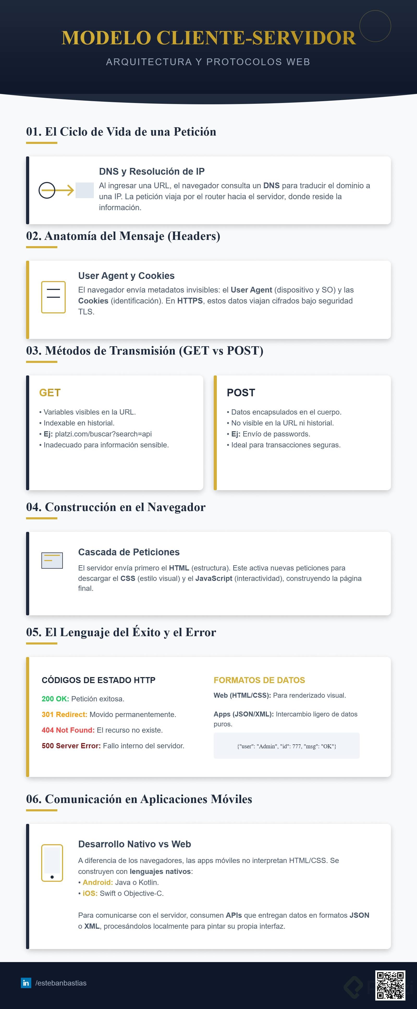 Cuando escribes una dirección web como platzi.com en tu navegador y presionas Enter, se inicia un proceso fascinante. Tu navegador actúa como cliente y envía una solicitud al servidor de Platzi. Pero antes, esta solicitud pasa por tu router, que convierte el nombre de dominio en una dirección IP específica del servidor.