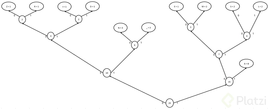 Siguiendo el orden de frecuencia, construimos nuestro árbol: