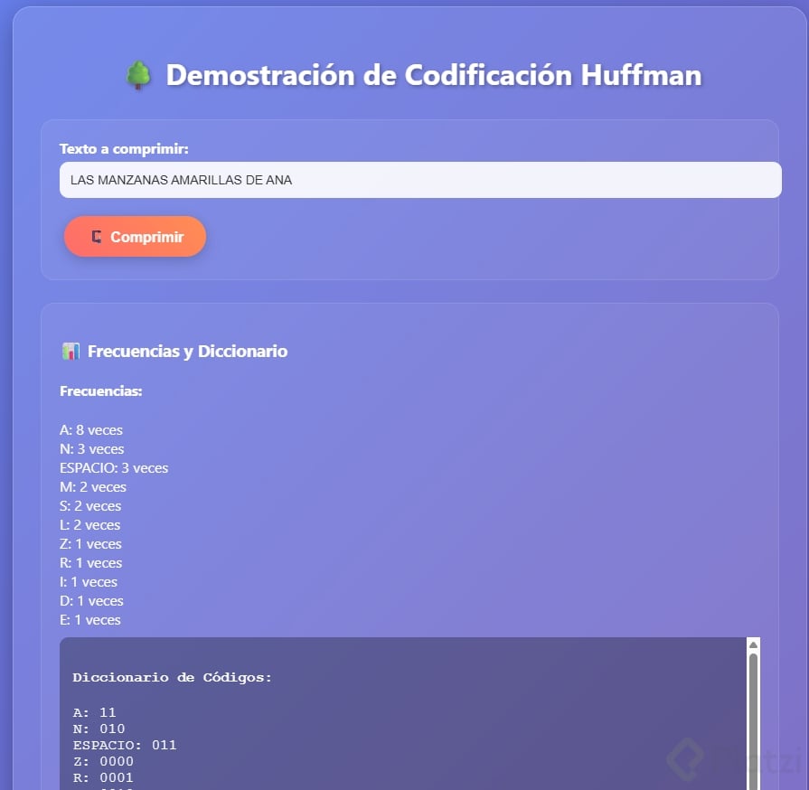 Al codificar toda la frase "MANZANAS AMARILLAS DE ANA", obtenemos una secuencia de 98 bits, en lugar de los 200 bits originales. Esto representa una compresión de más del 50%, lo cual es bastante significativo.