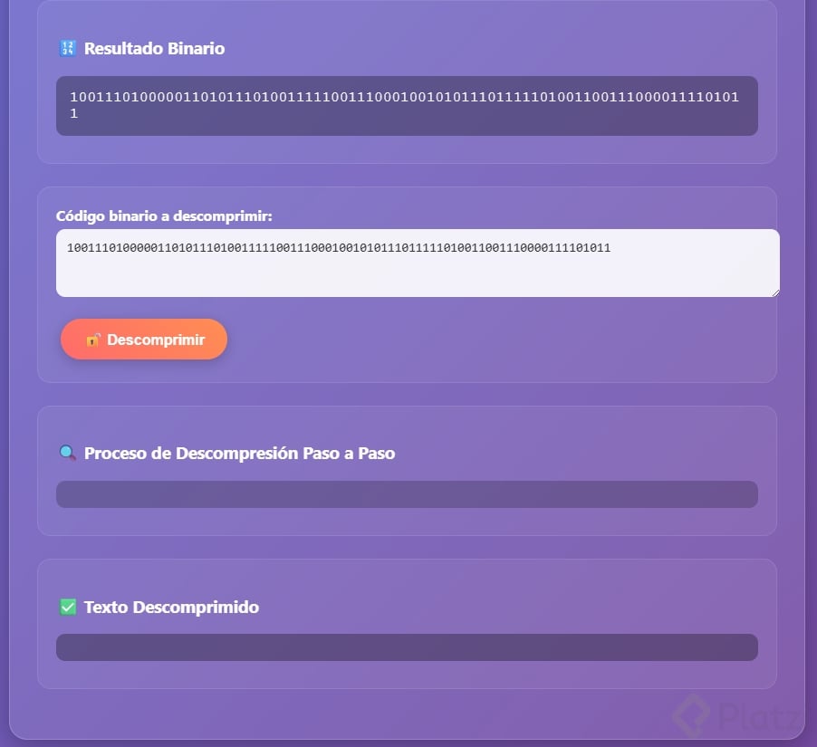 Por ejemplo, nuestros 98 bits comprimidos se agruparían en aproximadamente 13 bytes. Estos bytes, interpretados como caracteres ASCII, producirían una secuencia aparentemente aleatoria y sin sentido para el ojo humano.