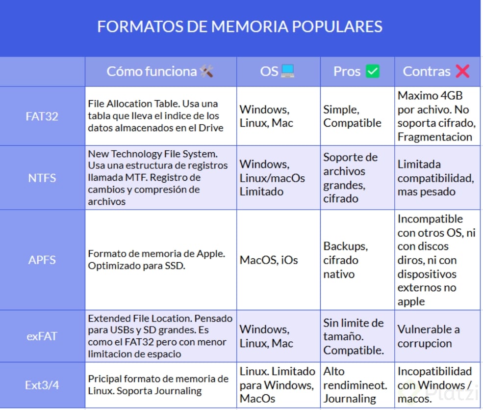 - FAT32: común en memorias USB, con limitaciones como el tamaño máximo de archivo (4 GB) y ausencia de seguridad.