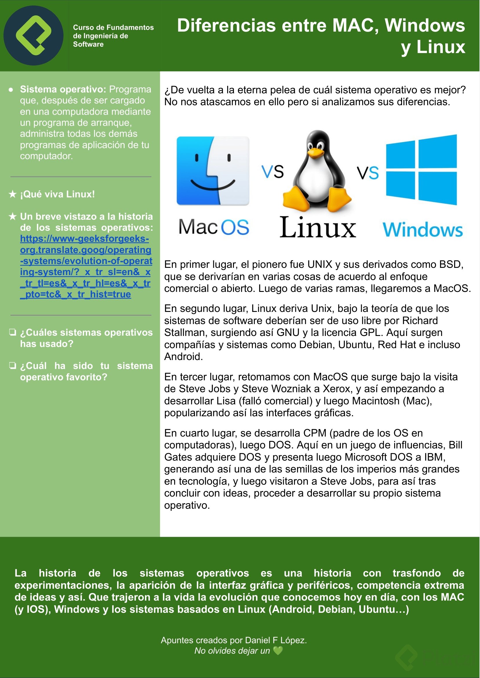 Linux: Preferido por desarrolladores de software profesionales y utilizado en la mayoría de servidores del mundo. Es un sistema abierto y gratuito.