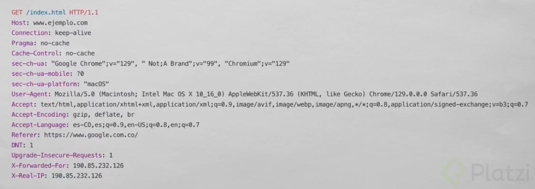 Cuando realizas una petición web, tu navegador envía datos adicionales que no son visibles para ti como usuario. Estos datos viajan en los "headers" o cabeceras HTTP: