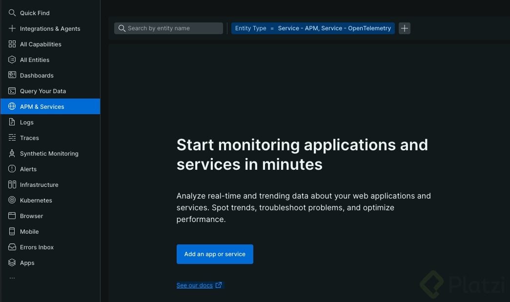 - Verifica en New Relic: Vuelve a tu cuenta de New Relic. Desde "APM & Services" en el menú lateral, confirma que la aplicación aparece y está bien configurada.