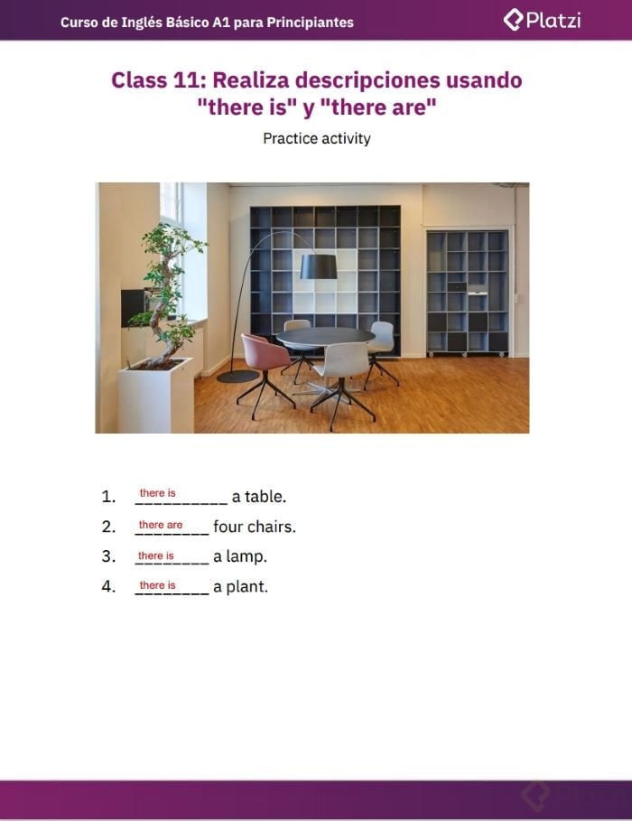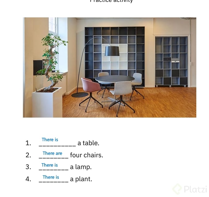 Ahora que conoces la teoría, es hora de ponerla en práctica. Observa los siguientes ejemplos y trata de imaginar o describir una habitación o entorno de tu vida cotidiana utilizando there is y there are: