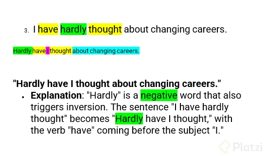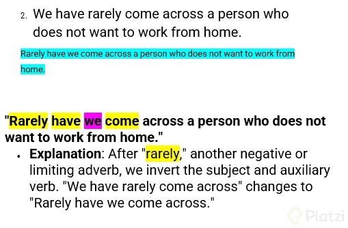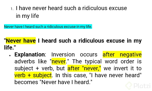 | Oración normal | Oración inversa | | --- | --- | | I have never heard such a beautiful voice | Never have I heard such a beautiful voice | | I have rarely seen use that strategy | Rarely have I seen anyone use that strategy |