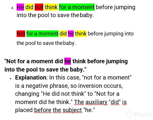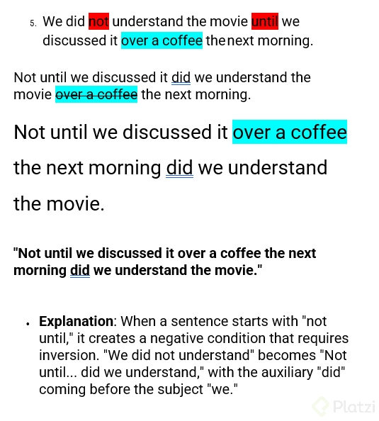 | Oración normal | Oración inversa | | --- | --- | | I did not think for a moment that I would get the job | Not for a moment did I think that I would get the job | | I did not realize my tablet was missing | Not until I reached home did I realize my tablet was missing |