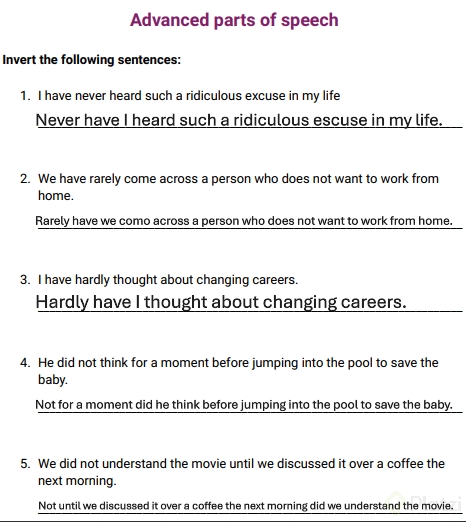 - Practice by rewriting standard sentences with negative adverbs or not expressions at the front.
