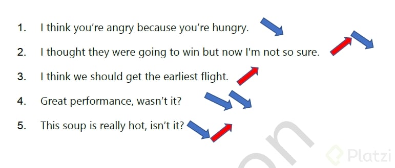 When you hold a definite opinion, you use a fall tone. Your pitch drops at the end of the sentence, signaling confidence and certainty. For example [1:22]: