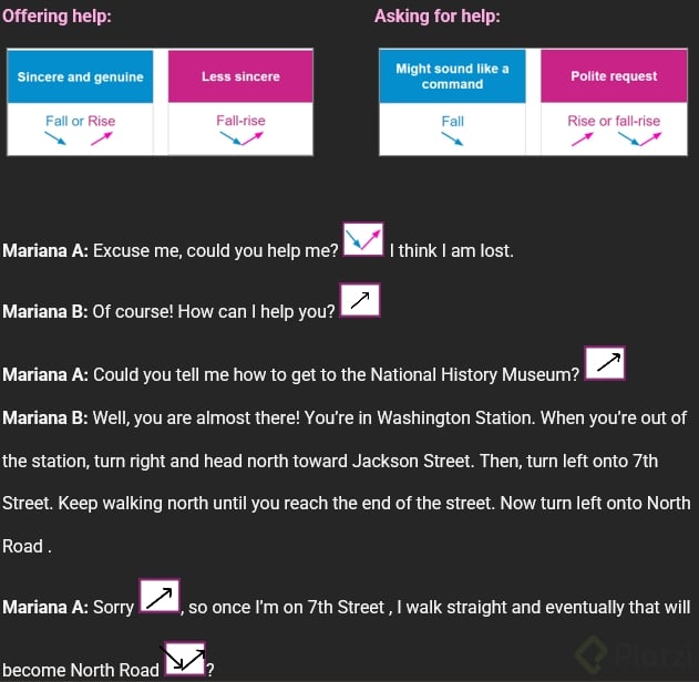 - Fall (descendente): convierte tu petición en algo parecido a un comando. "Could you help me?" con tono descendente suena más como una instrucción que como un favor.