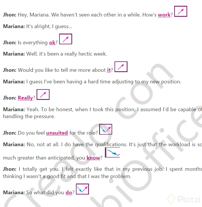 The conversation between two colleagues demonstrates all of these intonation strategies in action [1:53]. One speaker shares that she's been having a hectic week and struggling to adjust to a new position. The listener responds with "Really?" using a fall-rising tone to show interest and encourage her to continue [2:20].