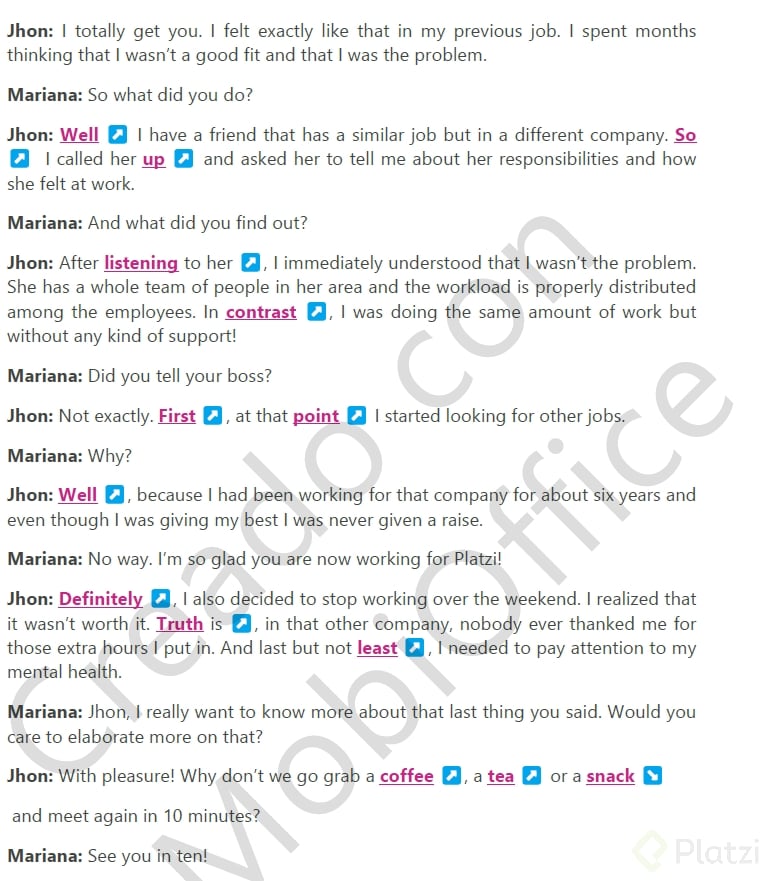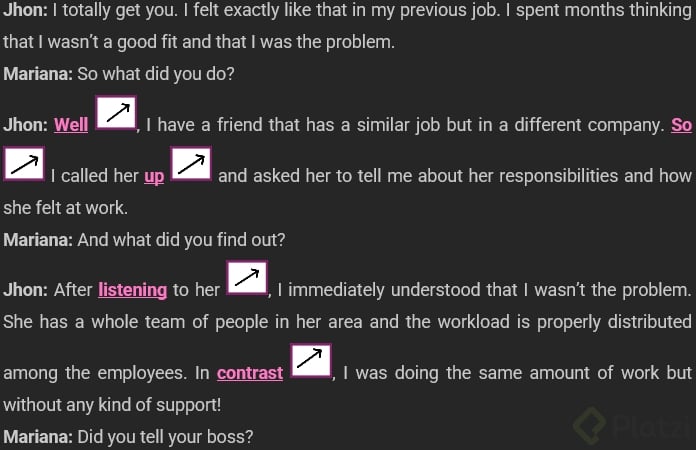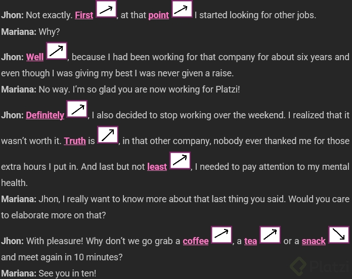 The conversation between two colleagues is rich with examples of how intonation and transition words work together in real communication.