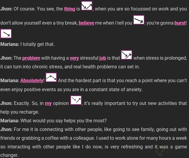 The role play in the lesson illustrates how these intonation patterns work in real conversation [3:45]. The dialogue touches on mental health and chronic stress — when stress is prolonged, it can lead to real health problems and a constant state of anxiety. Key strategies mentioned include: