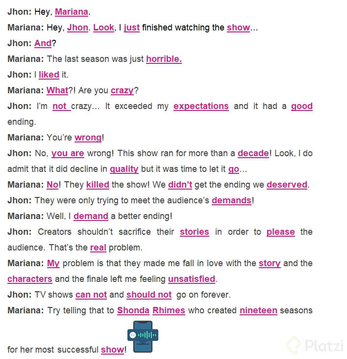 - Mariana y John discuten sobre una serie de televisión. John enfatiza palabras para defender su punto de vista: "It exceeded my expectations and it had a good ending."