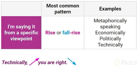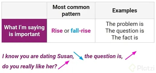Al enfatizar lo importante de un mensaje, el uso de una subida o una caída de la entonación es crucial. Frases como "el problema es", "la cuestión es" y "el hecho es" ayudan a que el oyente preste atención. Por ejemplo, en una discusión podrías decir: "I know you're dating Susan. The question is, do you really like her?" Esta entonación destaca la pregunta en sí misma como crucial.