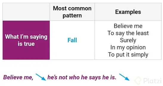 Si lo que decimos es cierto, tendemos a usar una caída en la entonación. Frases como "créanme", "seguramente" o "a decir verdad" son ejemplos típicos donde una caída en la voz refuerza la veracidad. Por ejemplo, "Believe me, he's not who he says he is." Este estilo de entonación suele desprender un aire de certeza y seguridad.