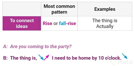 Cuando tratamos de conectar ideas, una subida o una caída de la entonación puede ser útil. Expresiones como "the thing is" o "actually" sirven para introducir o vincular conceptos. Imagina que te preguntan si vas a ir a una fiesta: "Are you coming to the party?" y respondes, "The thing is I need to be home by 10 o'clock." La entonación aquí suaviza una noticia inconveniente.