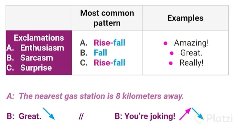 Para expresar entusiasmo, una subida y caída rápida de la entonación puede hacer que algo suene emocionante, por ejemplo, decir "amazing" con entusiasmo se convierte en "Amazing!". Por el contrario, para el sarcasmo, solemos usar menos variaciones en la voz, haciendo que algo parezca irónico, como cuando se dice "great" de manera sarcástica.