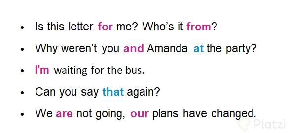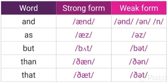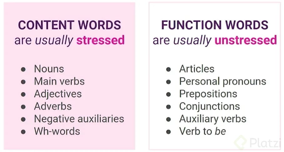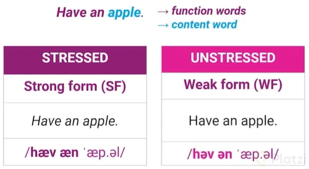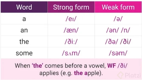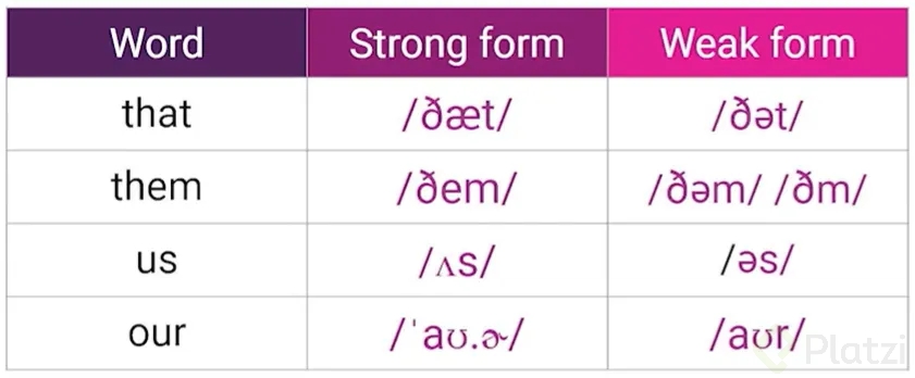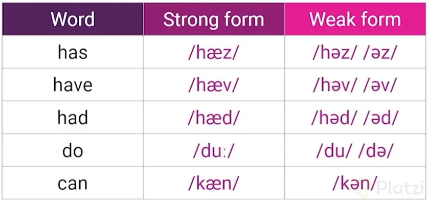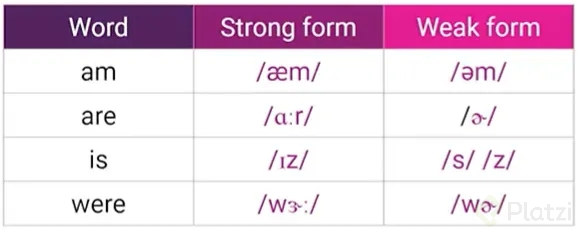 Formas débiles: Son aquellas palabras que generalmente no son enfatizadas, creando una especie de flujo en la oración. Incluyen artículos, pronombres personales, preposiciones, conjunciones, verbos auxiliares y el verbo to be.