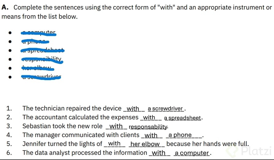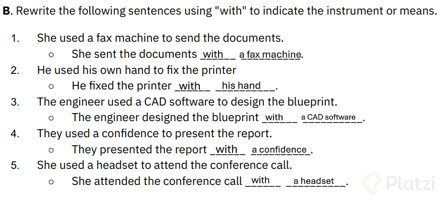 "With" helps us understand how an action is performed or what tool or method is used to complete it.