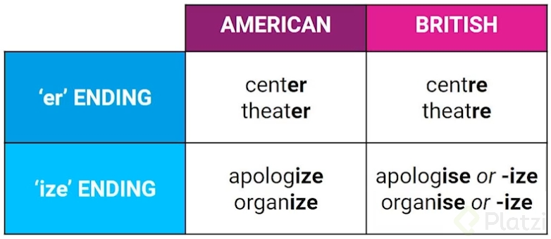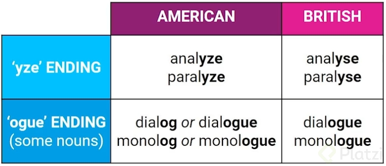 Las terminaciones de verbos también pueden diferir. En inglés americano, se prefiere la forma -ize, y en británico, es común ver -ise: