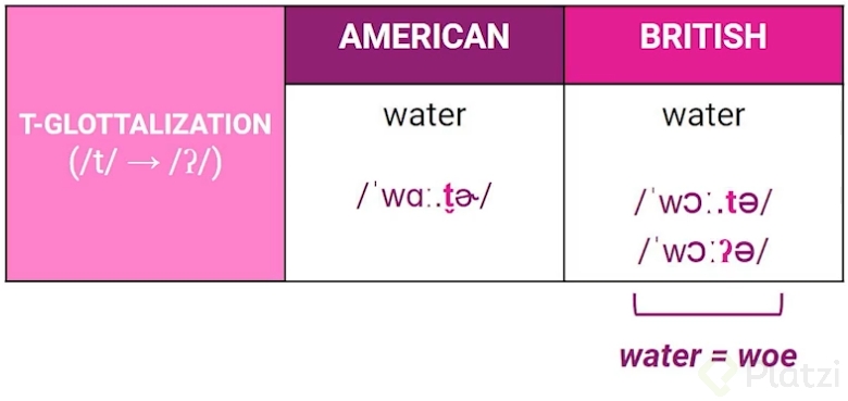 Por otro lado, en ciertos acentos británicos, especialmente el cockney, se emplea la glotalización T. Así, la palabra "water" puede sonar como wa'er. Este fenómeno elimina el sonido T y la convierte en un cierre glotal.