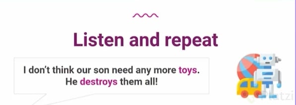 Este sonido, como en choice, va de labios redondeados a no redondeados. La lengua se eleva desde la parte frontal. Una práctica diaria sería: I don't think our son needs any more toys.